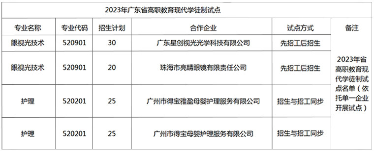 广州卫生职业技术学院2023年普通现代学徒制试点面向社会考生、应往届中职生、应往届高中生等(企业会要求个别专业报考人群为应往届中专对口专业学生,不招色盲色弱)。有2个专业,总计划100人。现代学徒制的自主招生考试时间为5月20日至5月21日(以我校通知为准)。